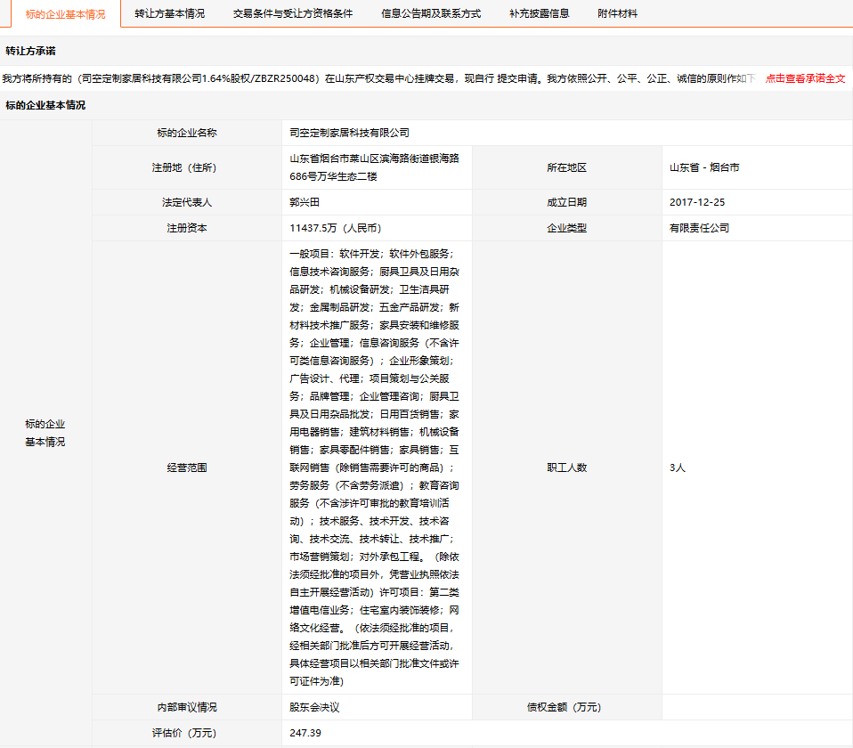 司空定制家居科技有限公司1.64%股權(quán)