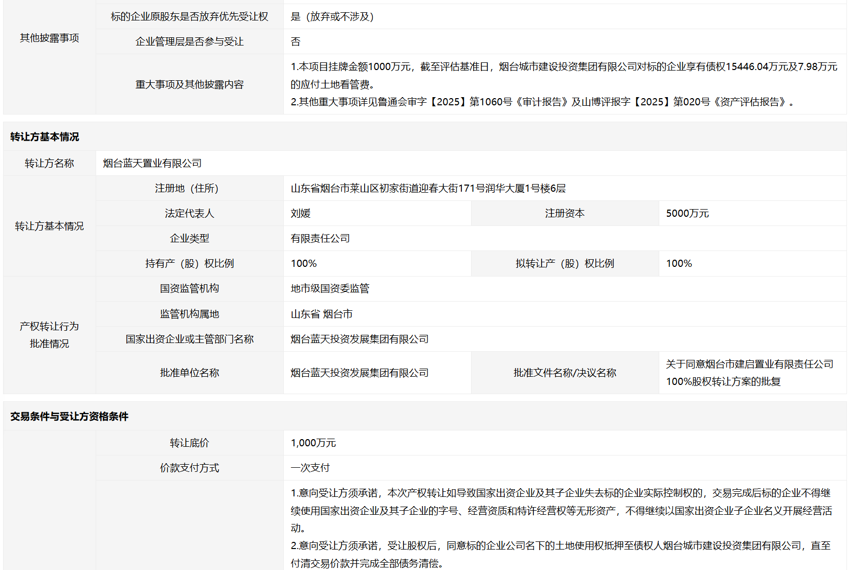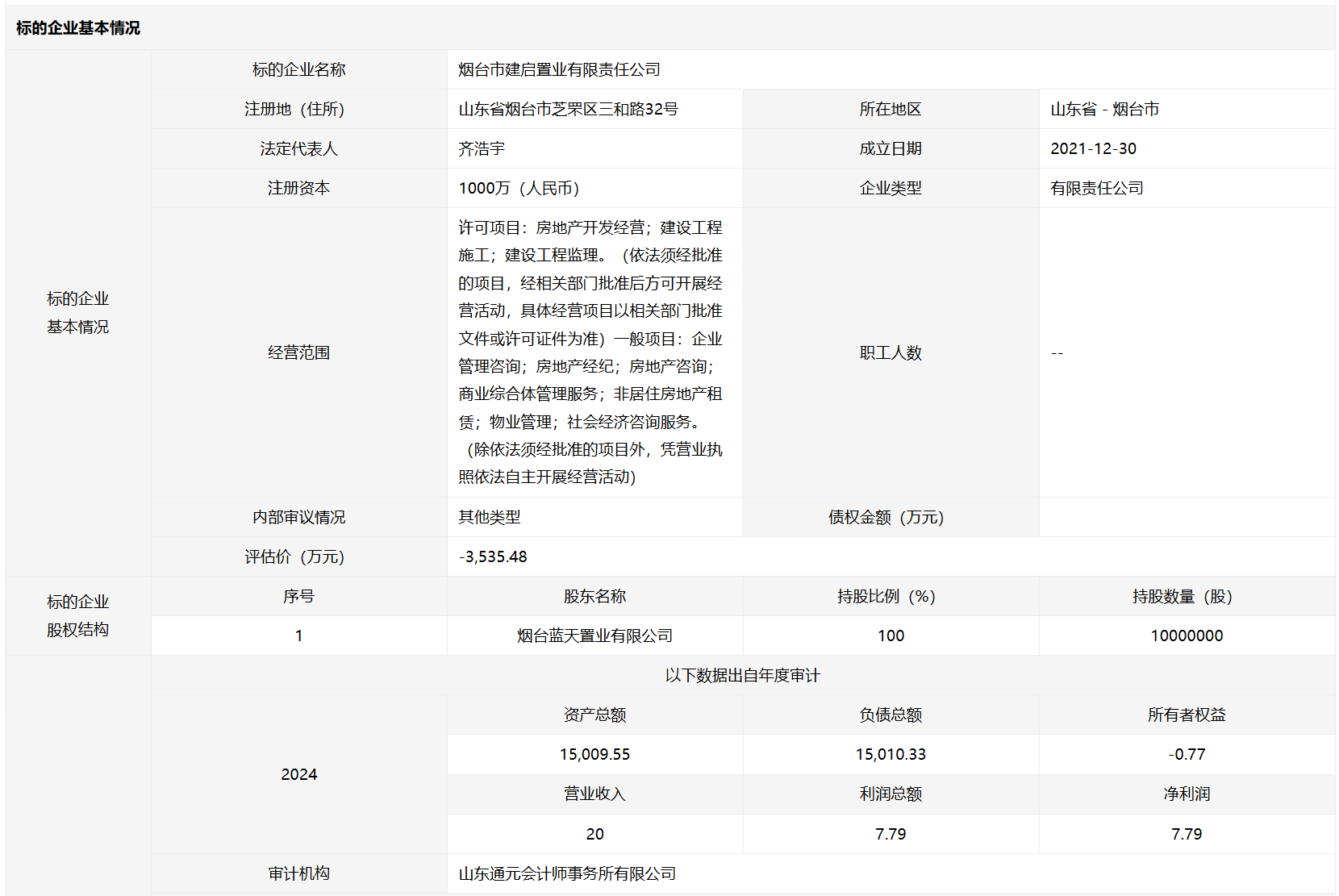 煙臺市建啟置業(yè)有限責(zé)任公司100%國有股權(quán)