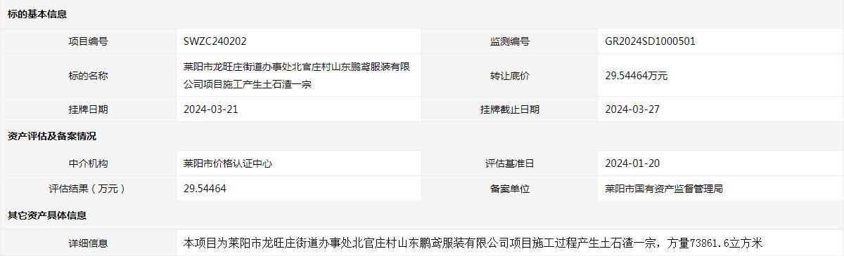 萊陽(yáng)市龍旺莊街道辦事處北官莊村山東鵬鳶服裝有限公司項(xiàng)目施工產(chǎn)生土石渣一宗