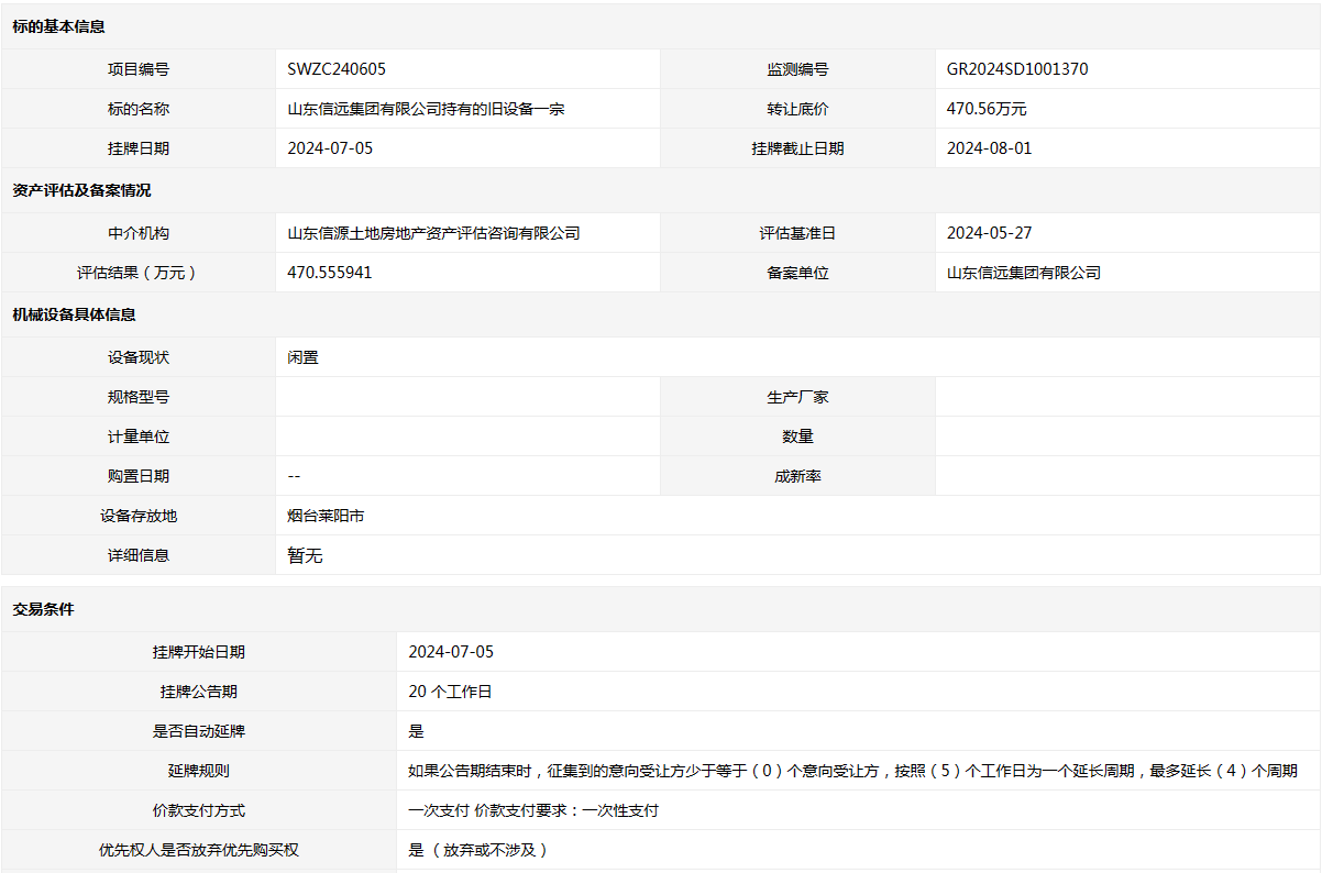山東信遠集團有限公司持有的舊設備一宗