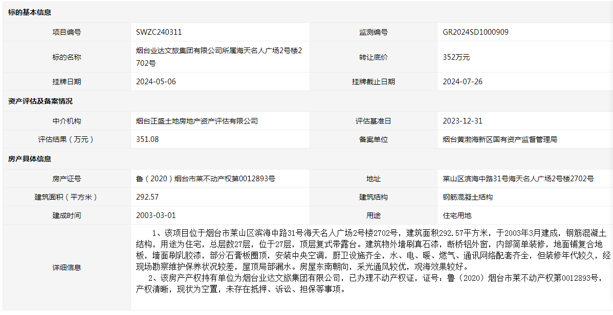 煙臺(tái)業(yè)達(dá)文旅集團(tuán)有限公司所屬海天名人廣場(chǎng)2號(hào)樓2702號(hào)