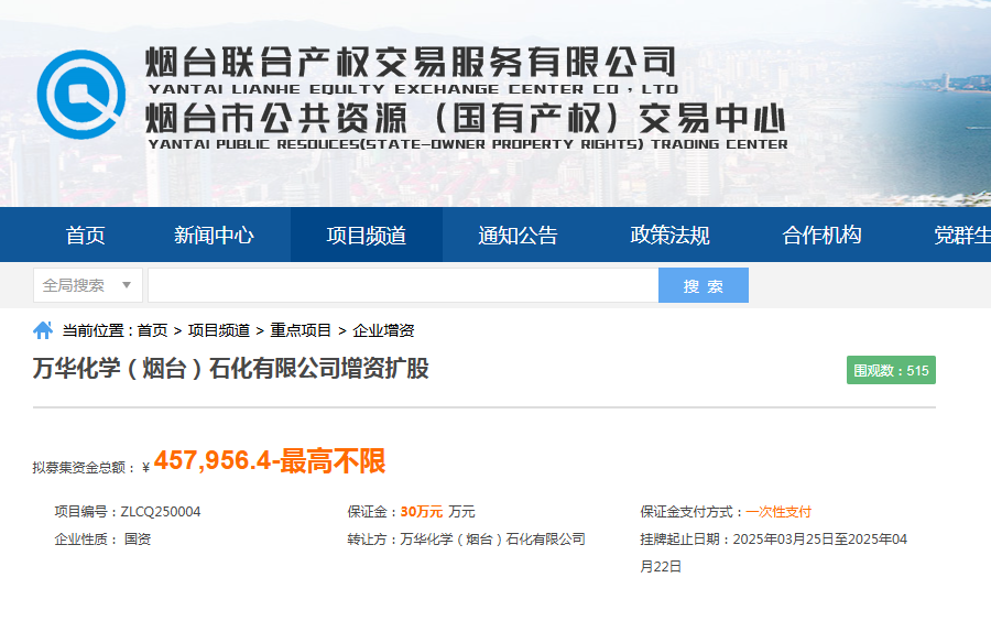近日,我市重點國企混改項目“萬華化學(煙臺)石化有限公司增資擴股”通過山東產(chǎn)權(quán)交易中心與煙臺聯(lián)合產(chǎn)權(quán)交易服務(wù)有限公司(以下簡稱“煙臺聯(lián)合產(chǎn)權(quán)”)聯(lián)合掛牌,成功實現(xiàn)45.79億元增資目標。本次引入境外投資方1家(增資后占股25%),為科威特石化工業(yè)公司(科威特石油公司全資子公司),該公司成立于1963年,位于科威特艾哈邁迪省,注冊資本6億科威特第納爾(約折合人民幣139.38億元),是科威特石化領(lǐng)域的核心企業(yè),在全球石化行業(yè)中占據(jù)重要地位。此次交易創(chuàng)下我市國有企業(yè)增資擴股單筆最高交易紀錄,標志著我市要素交易平臺服務(wù)國企改革取得新突破。